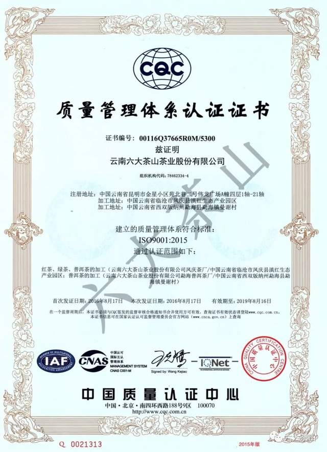 歷年來,六大茶山公司獲得國家有機(jī)食品認(rèn)證,通過SC認(rèn)證、食品出口衛(wèi)生注冊登記,云南省10大名品、云南省老字號、有機(jī)產(chǎn)品認(rèn)證企業(yè)、出口食品生產(chǎn)企業(yè)、中國茶葉行業(yè)百強(qiáng)企業(yè)、云南首批年份普洱茶質(zhì)量保薦溯源企業(yè)、云南首款曬青茶質(zhì)量保薦溯源企業(yè)、HACCP體系認(rèn)證企業(yè),通過ISO9001質(zhì)量管理體系認(rèn)證,ISO22000食品安全管理體系認(rèn)證。